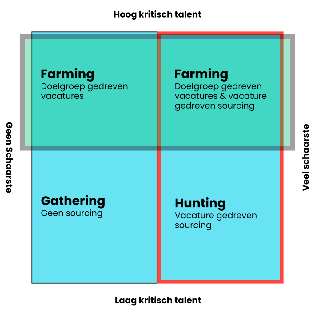 Er bestaan twee strategieën: doelgroep gedreven sourcing en vacature gedreven sourcing. Het sourcing kwadrant helpt je een strategie kiezen, welke het meest effectief is voor de vacature. Het kwadrant bestaat uit twee assen: de operationele kern en de wervingshaalbaarheid. Om te bepalen of een vacature tot de operationele kern behoort, kan je jezelf de volgende vraag stellen: ‘Behoren de taken van de functie tot de kernactiviteiten van de organisatie of is het een ondersteunende functie?’ en ‘Is de functie kritisch voor onze organisatie en moet deze altijd ingevuld zijn of is het niet erg als deze functie af en toe wat langer onbezet is?’.